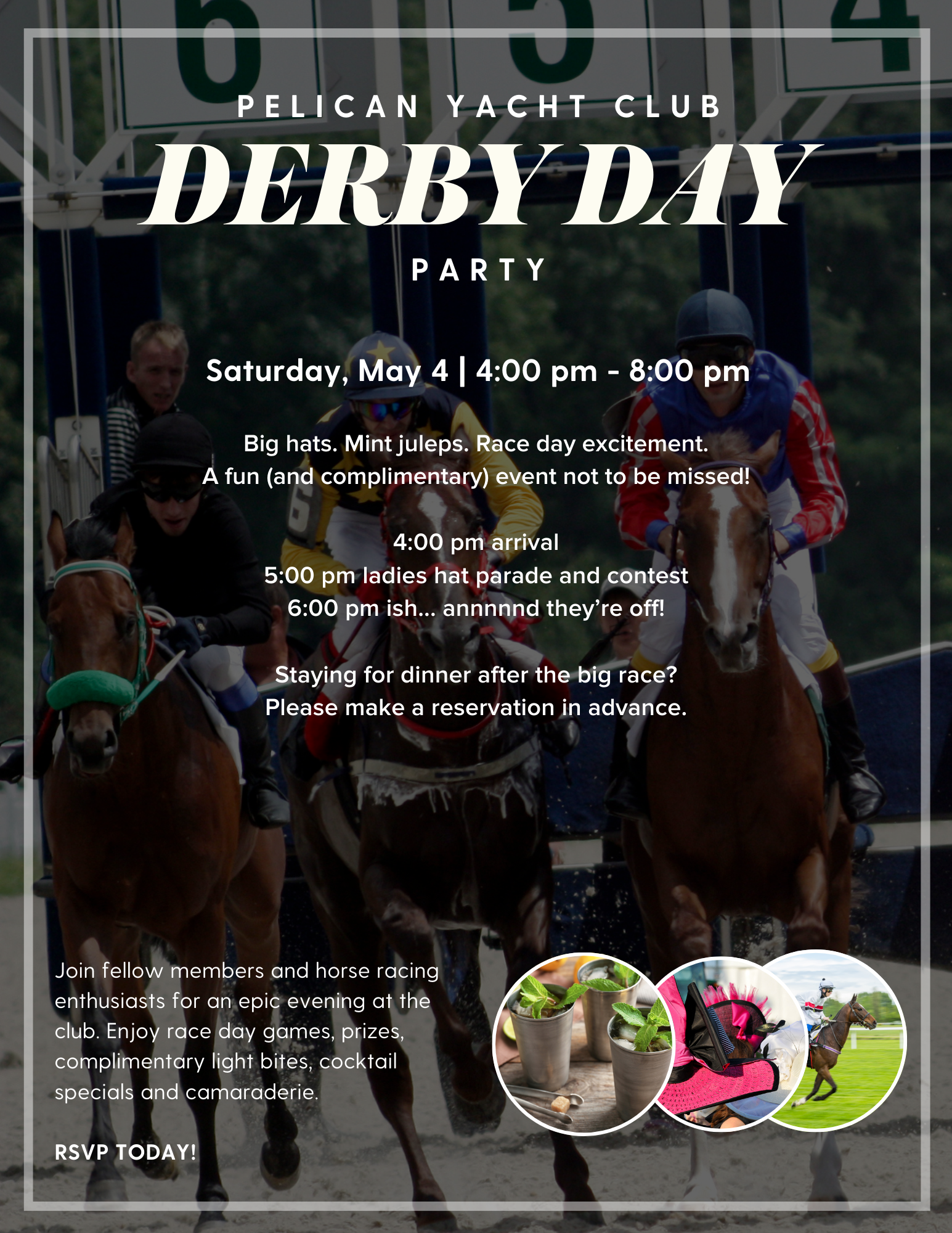 Back to All Events Kentucky Derby Saturday, May 4, 2024 4:00 PM 8:00 PM Google Calendar ICS Make Reservation here